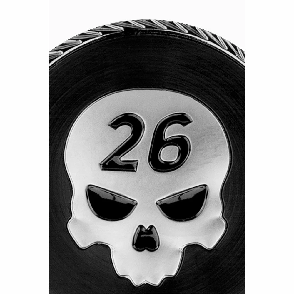 - Front insert: Skull in satin gun metal plated with recessed features painted in black, background is radial brushed with black anodizing